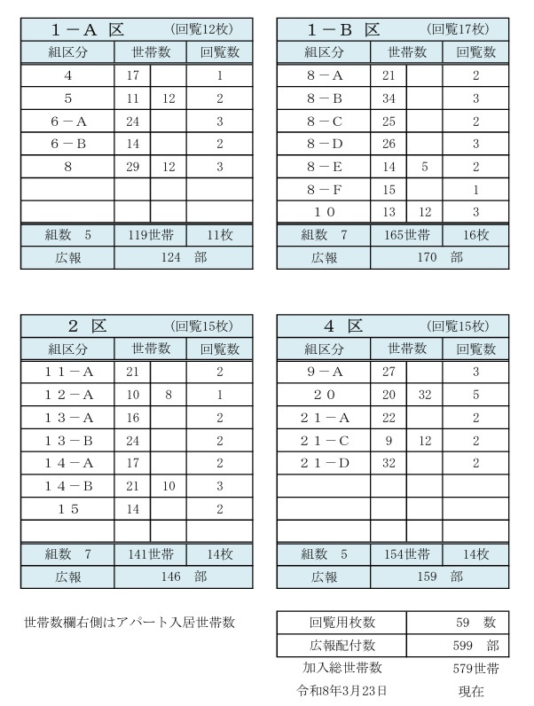 | 区長 | 区長は、会長・副会長を補佐し、4つある区をそれぞれ総括する。 |
